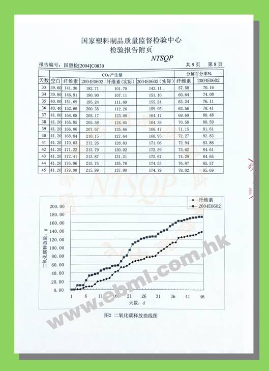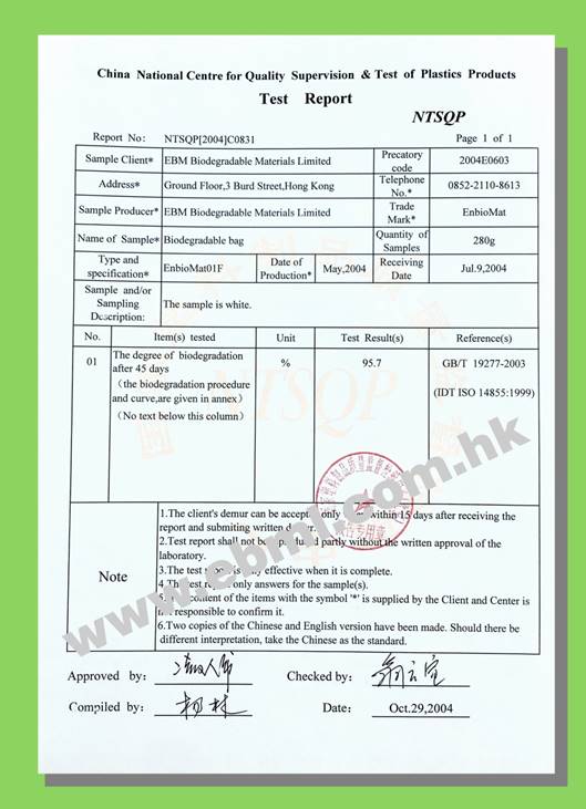 EnbioBags的生物可完全分解性及可完全堆肥能力測試由北京權威檢測中心NTSQP 根據ISO14855及中國國標GBT19277進行,並獲頒發合格証明書。 |