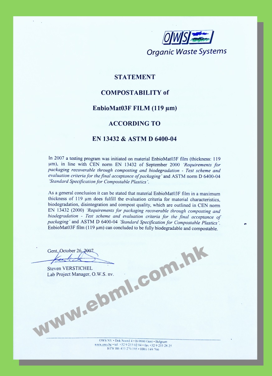 EnbioBags 的生物分解性及堆肥性完全符合EN13432及ASTM