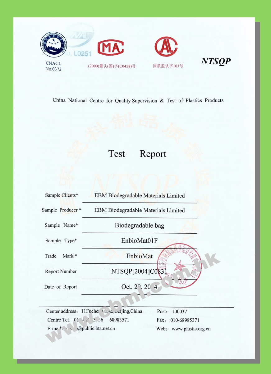 EnbioBags的生物可完全分解性及可完全堆肥能力測試由北京權威檢測中心NTSQP